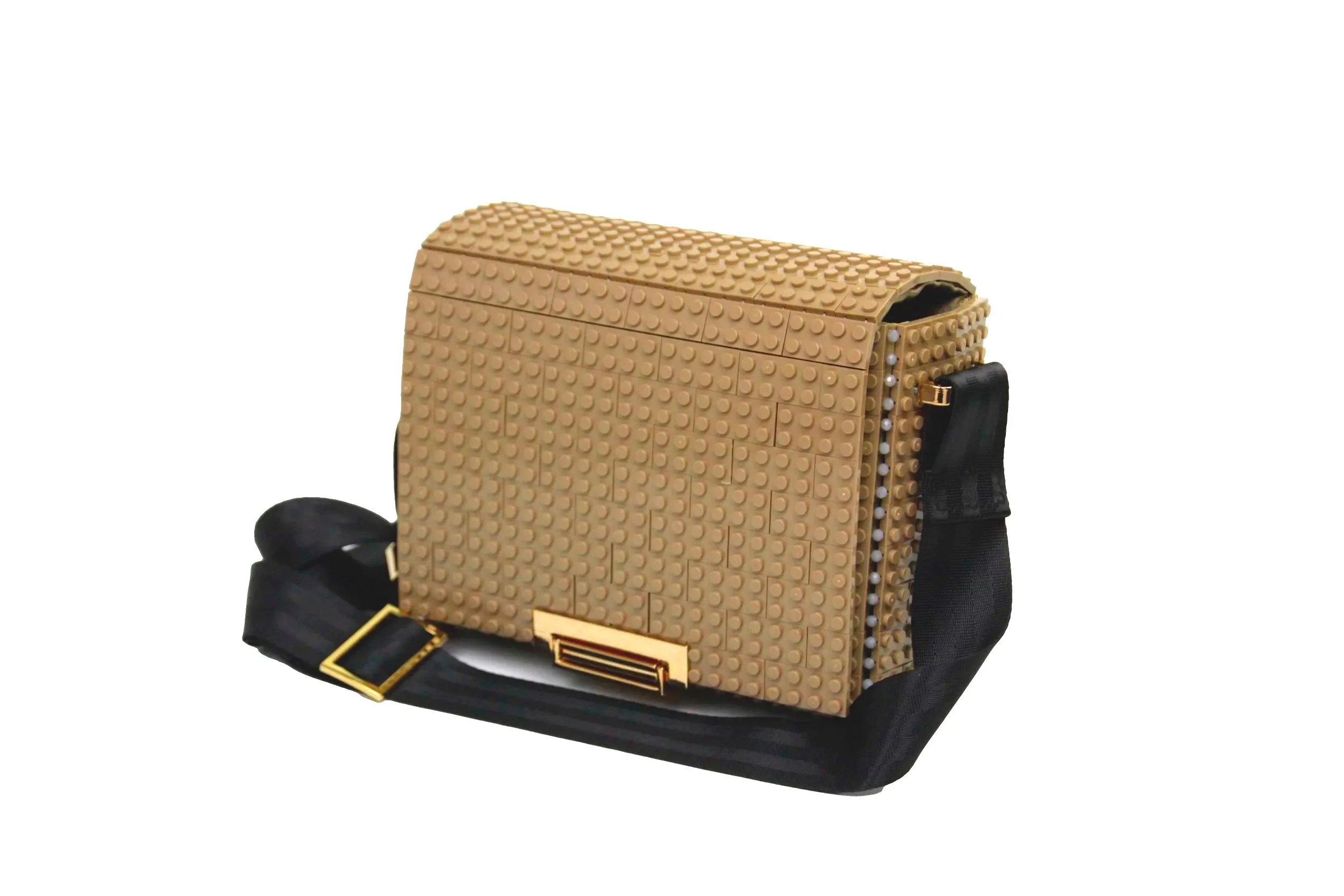 Dimensiones 24cm x 17cm x 10cm. Peso 480gr+230gr la correa de cuero y cadena metálica. Formado por 286 bloques de ABS ensamblados a mano. Incluye funda guardapolvo de algodón, bolsillo interior, asa de nylon de longitud ajustable de 90 a 150 cm.