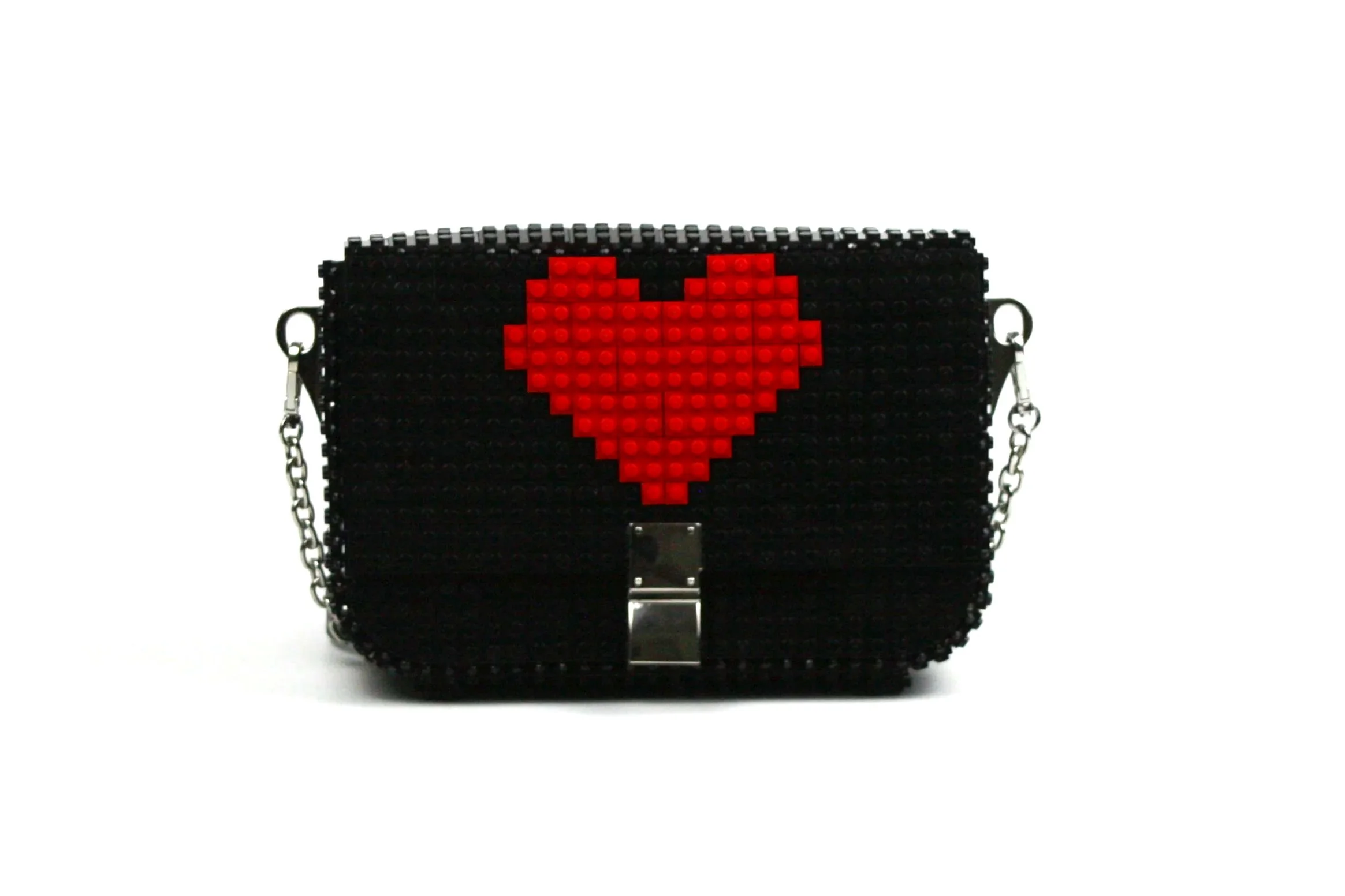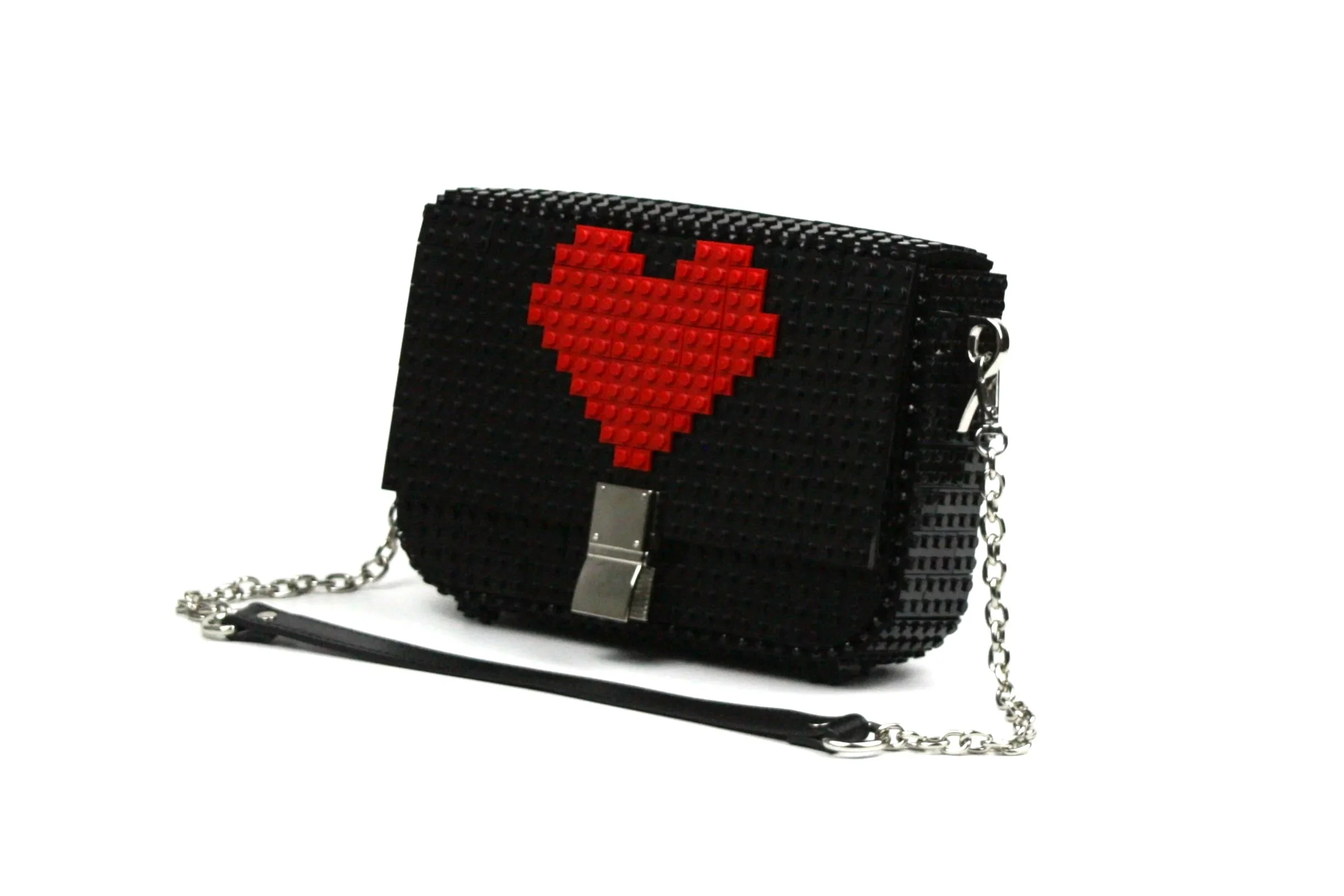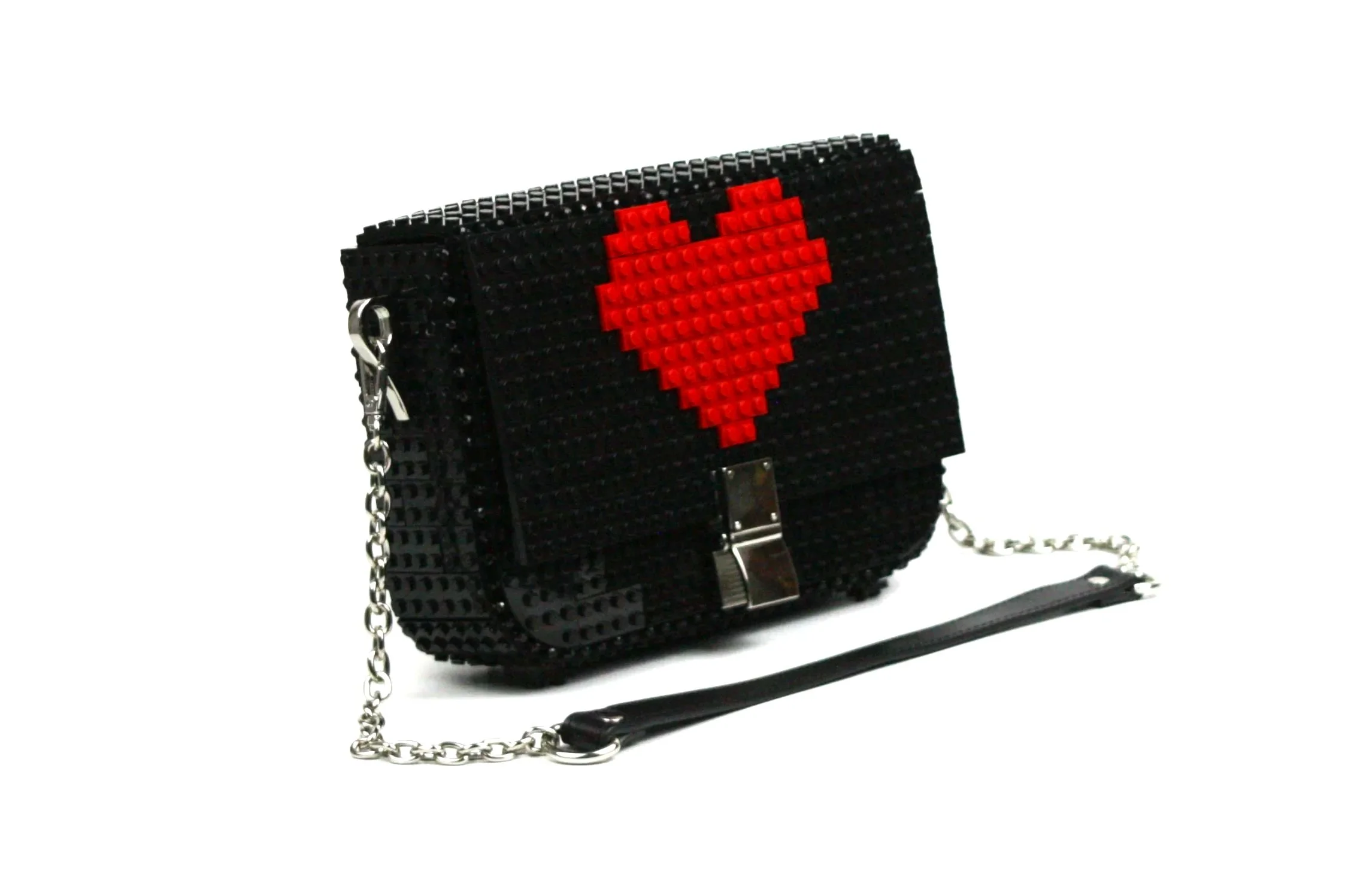 Dimensiones 25cm x 13cm x 6cm. Peso 370gr + 130gr la cadena metálica. Formado por 266 bloques de ABS ensamblados a mano. Incluye funda guardapolvo de algodón, bolsillo interior y cadena metálica de quita y pon de 105 cm de longitud, si desea otro largo o un asa adicional por favor contáctenos al realizar el pedido.